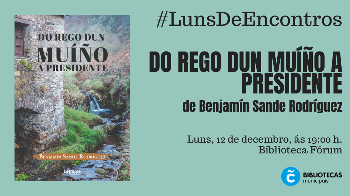 O próximo luns 12 de decembro ás 19 h. na Biblioteca Fórum Metropolitano temos a presentación do libro "Do rego dun muíño a presidente" de Benjamín Sande Rodríguez, publicado por Letrame Editorial.