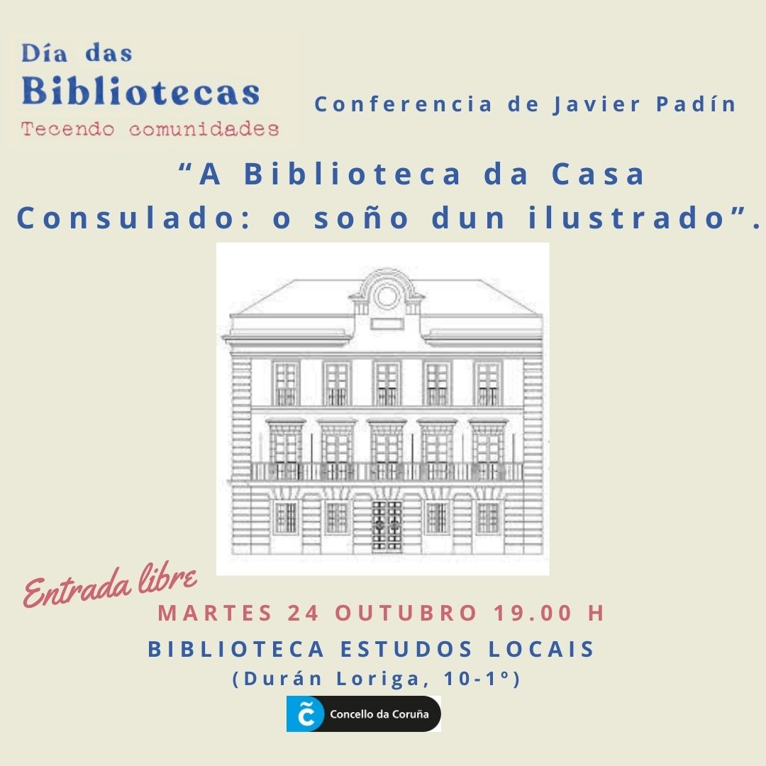 A Biblioteca de Estudos Locais é a biblioteca municipal coruñesa especializada na cidade. Este interese céntrase o día 24 de outubro, Día das Bibliotecas, en coñecer as bibliotecas que houbo e as que hai. Este ano coñeceremos a Biblioteca Casa Consulado, a máis antiga en funcionamento da Coruña. Falaranos dela o Presidente do Padroado da Fundación Biblioteca Casa Consulado, Javier Padín Martínez.