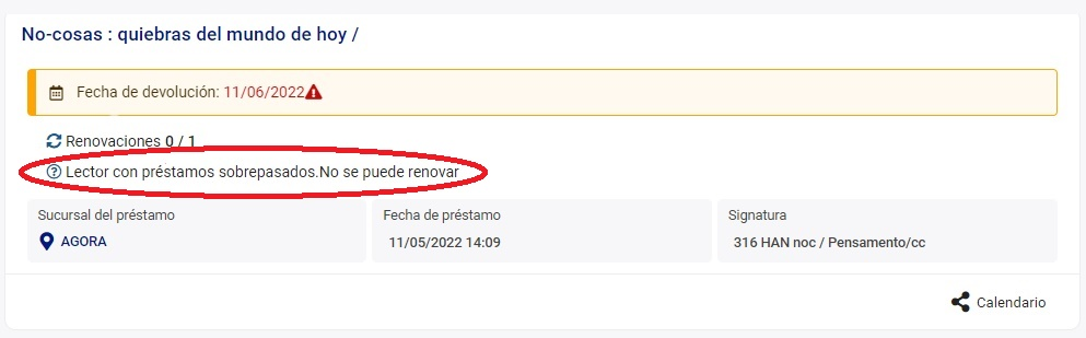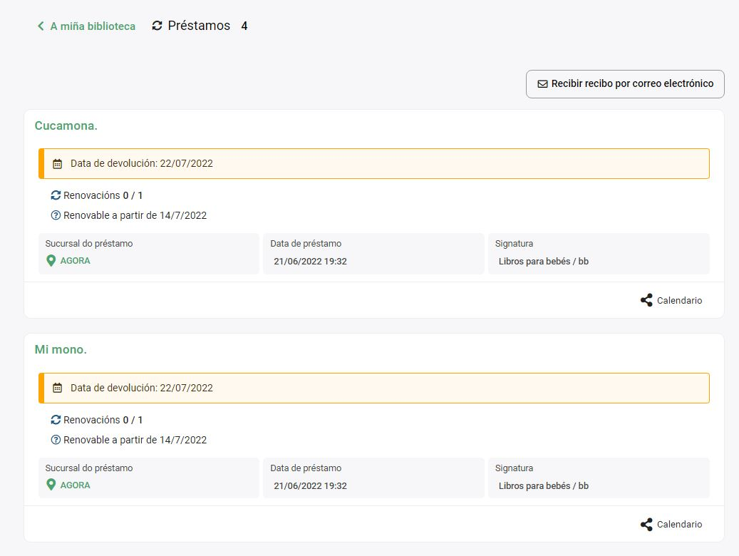 Cando o documento pode renovarse, estará claramente indicado a carón das datas de préstamo e devolución do título (ou títulos) que che interese renovar.