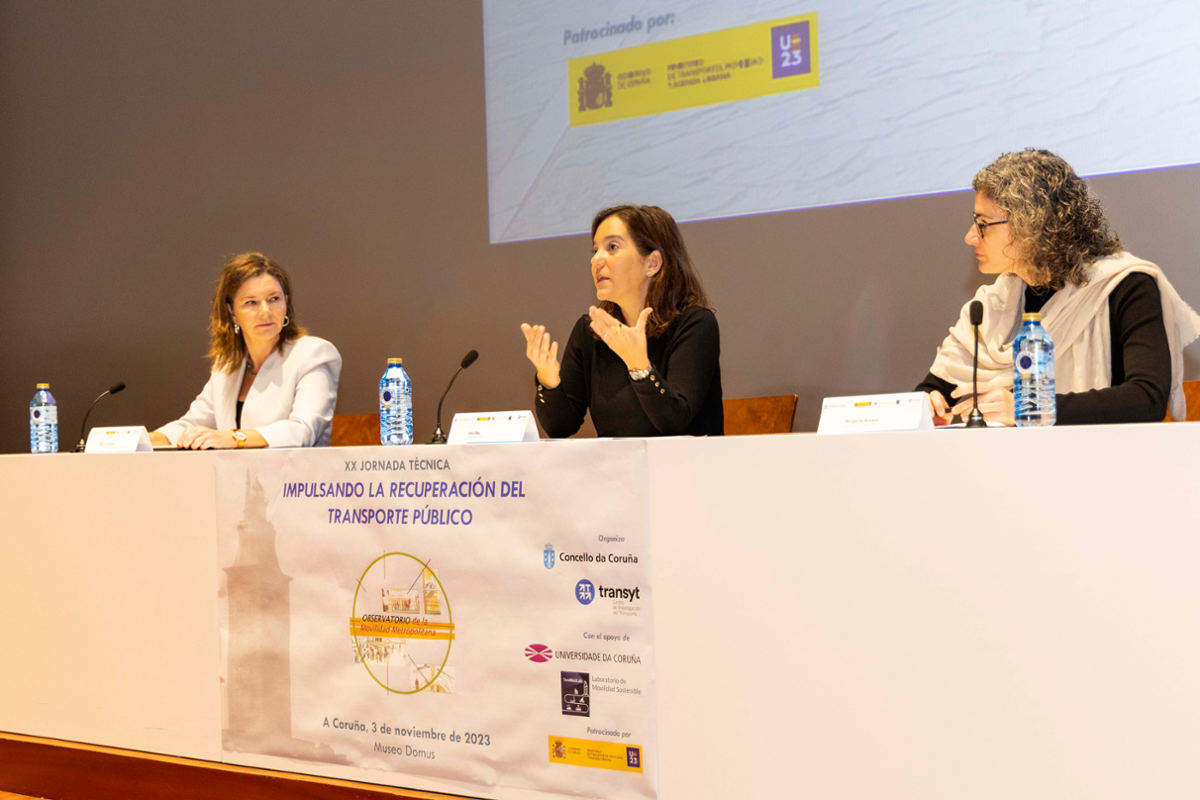 A alcaldesa, Inés Rey, interviu esta mañá na apertura da XX Xornada Técnica do Observatorio da Mobilidade Metropolitana na Domus sobre o impulso á recuperación do transporte público. Rey estivo acompañada por Margarita Novales, enxeñeira de camiños da Universidade da Coruña; e María José Rallo, secretaria Xeral de Transportes e Mobilidade do MITMA.