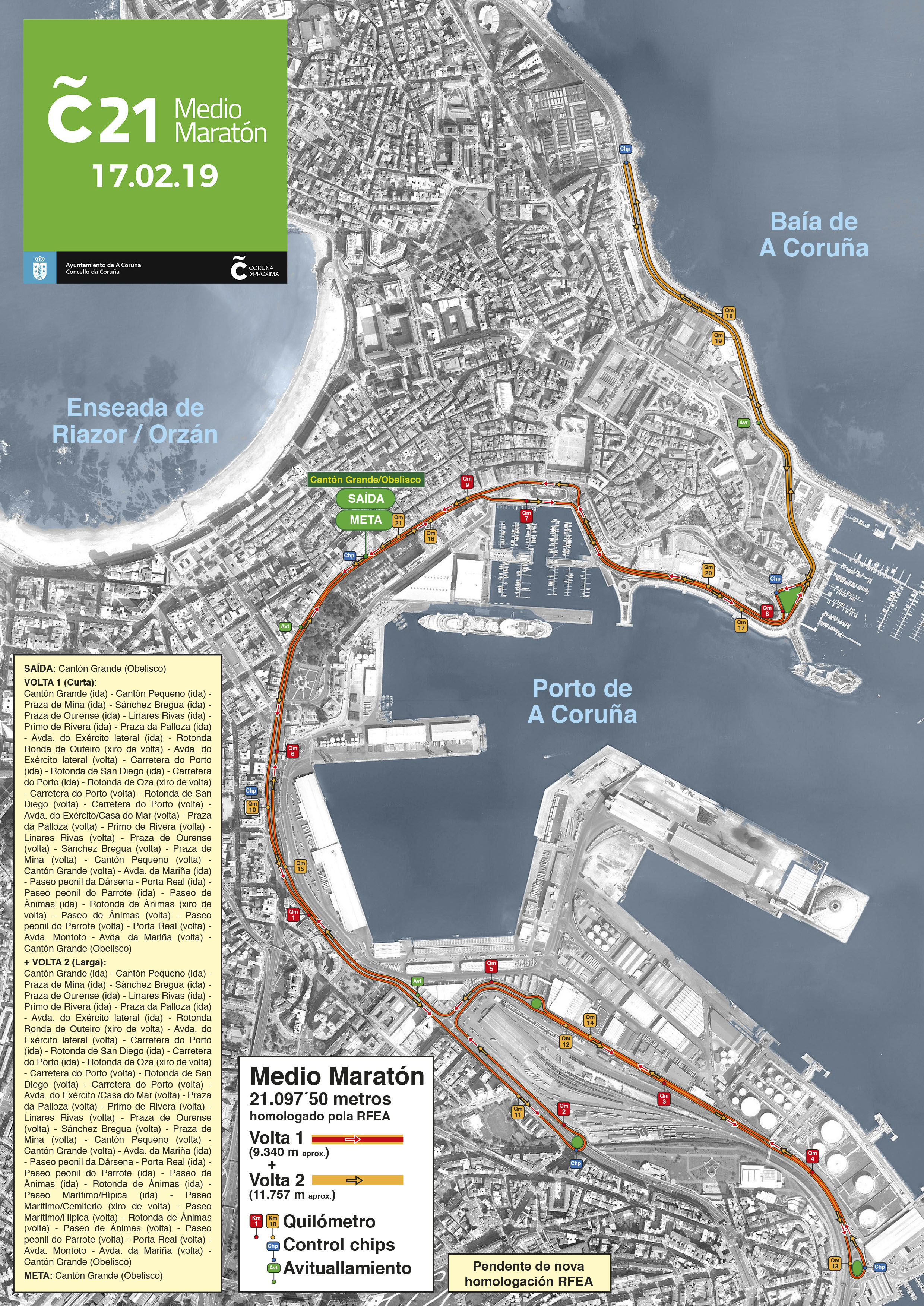 Coruña21 conta cunha distancia homologada pola RFEA de 21.097,50 metros, nun circuíto de dúas voltas "moi rápido e chairo, polo que favorece boas marcas", segundo explicou a directora técnica da FGA, e que parte do Obelisco e percorre a avenida Linares Rivas, avenida do Exército e a Estrada do Porto. Na rotonda de Oza as e os atletas regresarán polo percorrido realizado até a rotonda das Ánimas, lugar no que emprenderán a segunda volta do trazado. Unha vez neste mesmo lugar, continuarán até o cemiterio de San Amaro polo Paseo Marítimo e, desde os Pelamios, afrontarán os últimos quilómetros do Medio Maratón. O peche da proba realizarase ás 12.30 horas e, como nas anteriores edicións, establecerase un tempo de 1 hora e 15 minutos no paso polo 10 km. Precisamente o tempo que se acade nos 10.000 metros obterá a consideración de oficial, "un aliciente que, unido ás condicións do trazado, fan que Coruña21 sexa moi atractiva para as e os atletas", apuntou González.