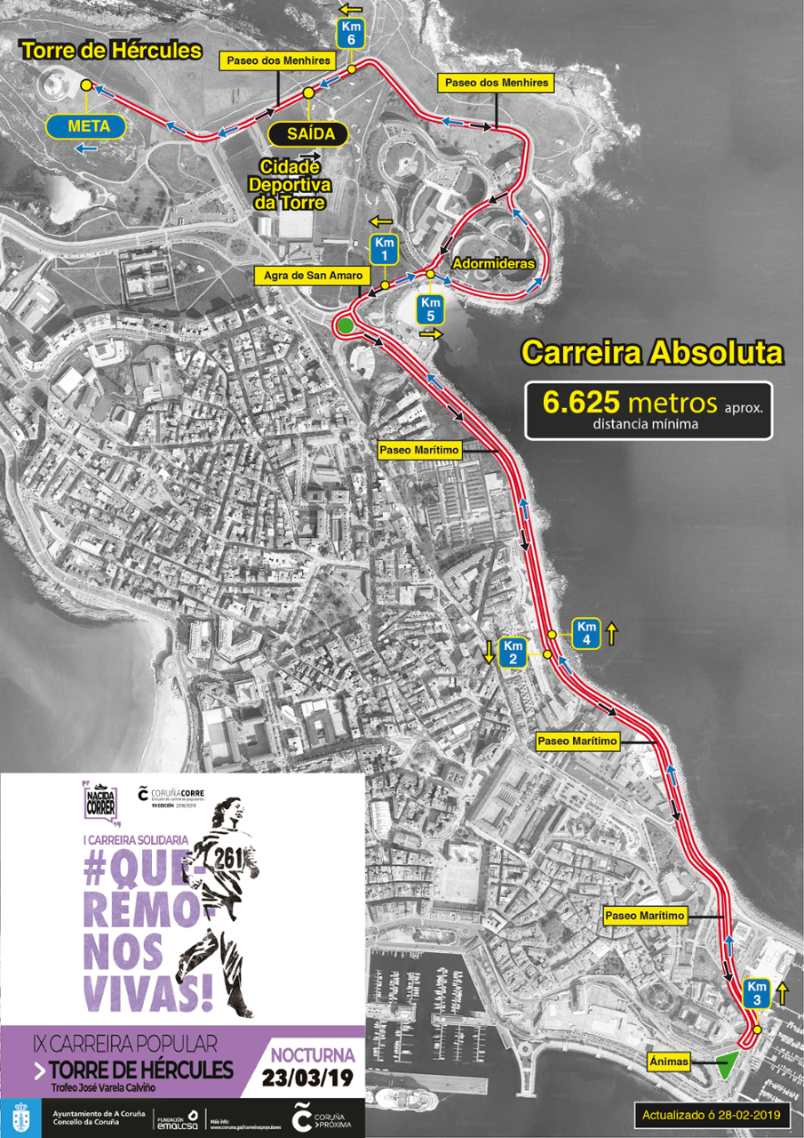A carreira absoluta partirá, como é habitual, en horario nocturno. Comezará ás 21.15 horas e o grupo partirá do Paseo dos Menhires, xunto á estatua de Breogán, para achegarse, a través do Paseo Marítimo, á rotonda das Ánimas. Xunto ao Castelo de Santo Antón darán a volta para volver por Pelamios e encarar os últimos metros da carreira subindo a rampla que leva á Torre de Hércules, punto no que se situará, un ano máis, a meta. Unha vez finalice a saída da categoría absoluta, comezará a andaina solidaria, na que todas e todos os participantes portarán o dorsal 261, o mesmo número que levou Kathrine Switzer --imaxe da carreira municipal-- no Maratón de Boston de 1967. As e os asistentes desta marcha, non competitiva, farán un percorrido de catro mil metros, compartindo itinerario coas e cos atletas da proba absoluta. Ao chegar ao 2 km, o grupo dará a volta para dirixirse á meta.