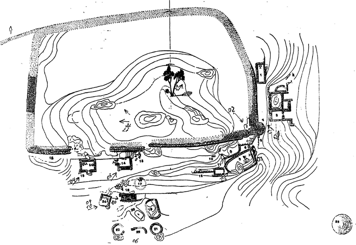 A primeira escavación centraríase no lugar coñecido como A Cabaxe, na zona este, onde aparecería a Casa da Exedra, varias estruturas de planta rectangular con esquinas arredondadas e parte do sistema de acceso á croa na banda sueste.