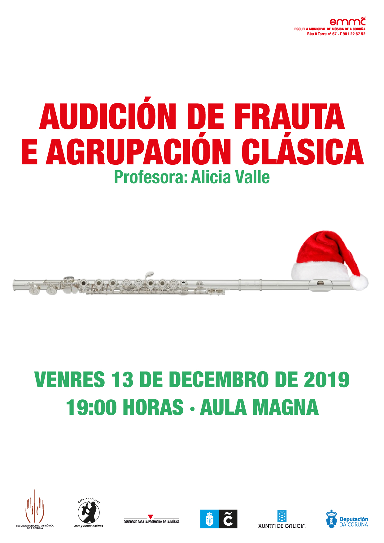 El viernes 13 de diciembre los alumnos de Flauta y Agrupación Clásica de la profesora Alicia Valle, darán una audición en el Aula Magna de la Escuela a partir de las 19:00 horas.