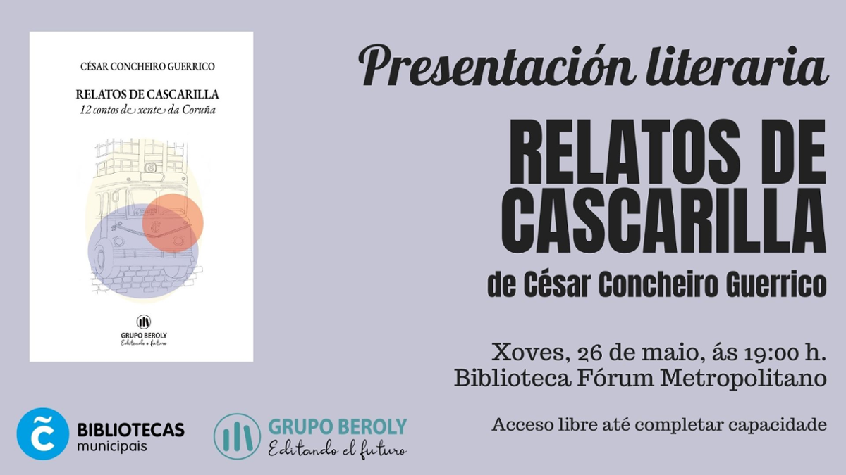 O xoves 26 de maio, ás 19:00 h, César Concheiro Guerrico presentará o seu libro "Relatos de cascarilla: 12 contos de xente da Coruña" acompañado da escritora Beatriz Maceda, a ilustradora do libro e escritora Laura Veleiro e os editores de o Grupo Beroly Bernabé Simes e José Manuel Yáñez.