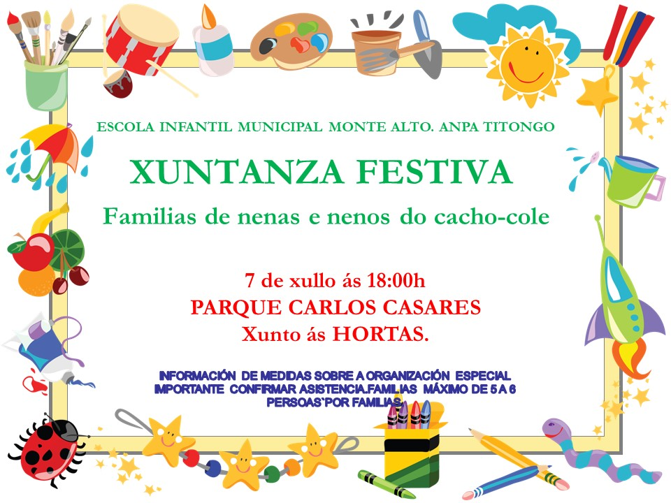 A EIM Monte Alto e a ANPA Titongo organizan unha xuntanza festiva de despedida do curso 2019-2020, unha celebración que quere ser un lugar de encontro das nenas e nenos do cacho-cole, que xa marchán para os coles de maiores.