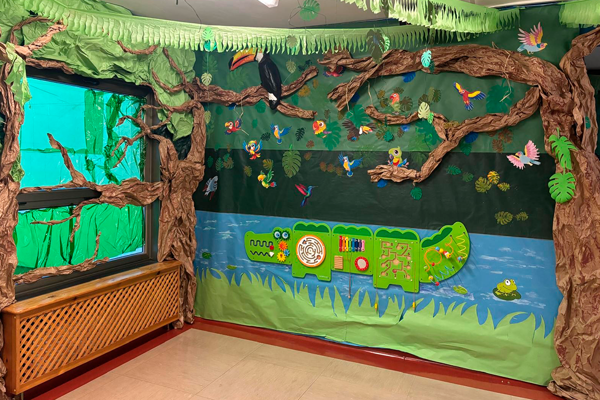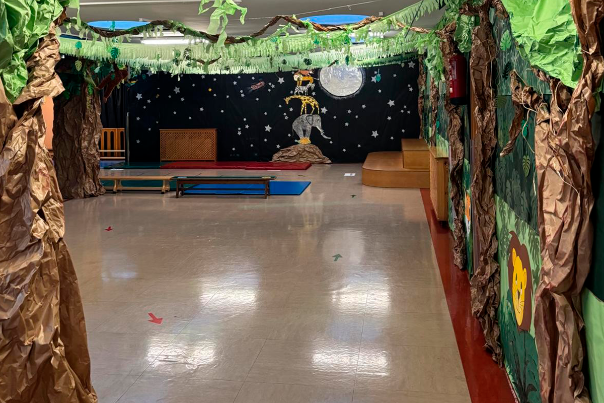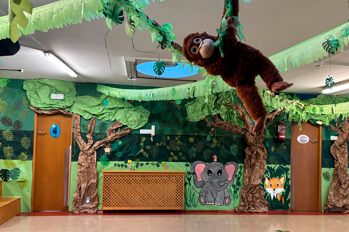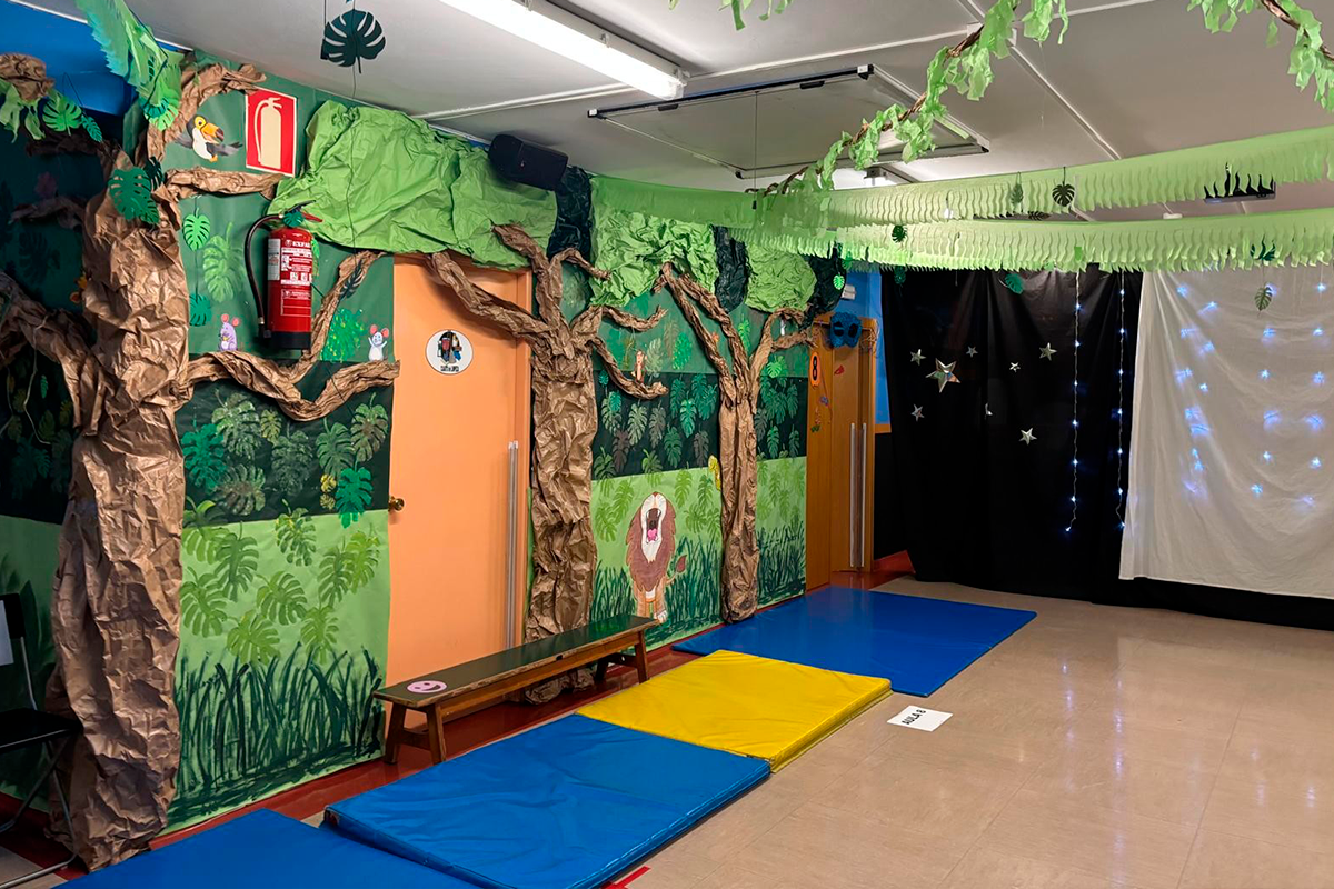 La escuela del patio se transforma en una frondosa selva para que los niños y niñas de la escuela celebren su gran fiesta de Entroido