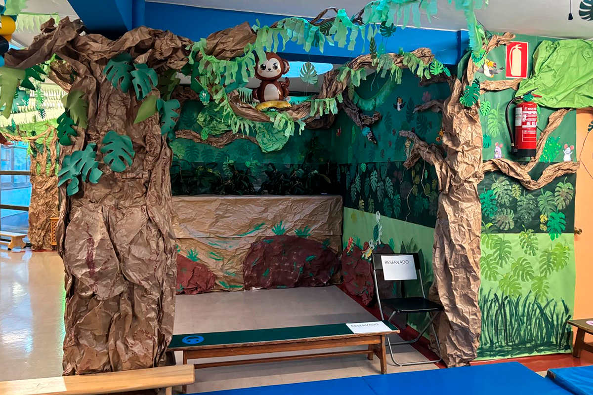 El patio de la escuela se ha convertido en una gran y frondosa selva en la que los niños, padres y profesores, disfrazados de animales del cuento "A qué sabe la luna", harán un desfile, disfrutarán de una actuación de los padres y madres y, finalmente, gozarán con la desgutación de los postres típicos del Entroido.