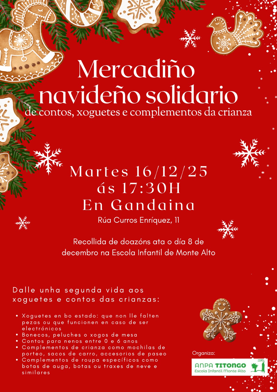 A Asociación de pais e nais da Escola Infantil Municipal Monte Alto (ANPA Titongo) organiza, un ano máis, o seu Mercadiño Navideño Solidario.