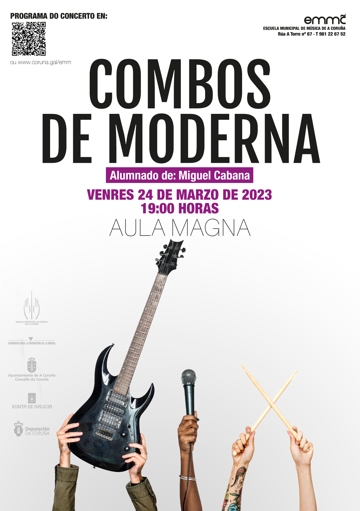 O venres 24 de marzo o alumnado de Combo de Moderna do profesor Miguel Cabana dará un concerto na Aula Magna a partir das 19.00 horas.