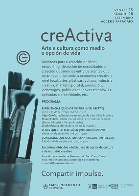 El Concejal de Empleo y Economía Social, Alberto Lema Suárez se complace en acercarle la información relativa a las Jornadas creActiva, arte y cultura como medio y opción de vida, que se celebrarán en el marco del Programa EMPRENDIMIENTO CORUÑA, y que tendrá lugar los próximos días 15 y 16 de Septiembre de 2017 en las Instalaciones del centro municipal de con el-working ACCEDE Papagaio.