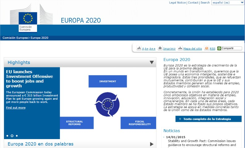 La Comunicación de la Comisión Europea (Bruselas, 3 de marzo de 2010) es el documento base de la estrategia de Europa para los próximos años: "Una estrategia para un crecimiento inteligente, sostenible e integrador". La estrategia Europa 2020 trata de lograr un crecimiento inteligente a través de inversiones más eficaces en educación, investigación e innovación; sostenible, gracias al impulso decidido a una economía baja en carbono, e integrador, ya que pone el acento en la creación de empleo y la reducción de la pobreza. Esta estrategia se centra en cinco ambiciosos objetivos en las áreas de empleo, innovación, educación, reducción de la pobreza y cambio climático/energía.
