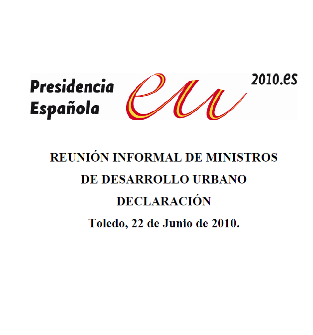 Este documento aprobado el 22 de junio de 2010 propone prioridades estratégicas de intervención en el desarrollo urbano desde el punto de vista medioambiental, social, económico y de la gobernanza con un enfoque integrado. Esta Declaración de Toledo se complementa con un documento de referencia sobre la Regeneración Urbana Integrada y su potencial estratégico para un desarrollo urbano más inteligente, sostenible y socialmente inclusivo en Europa, y tiene tres partes fundamentales: A) Cómo afrontar los retos urbanos actuales y aplicar la Estrategia Europa 2020, B) Desarrollar el Marco Europeo de Referencia de la Ciudad Europea y C) Consolidar en el futuro una Agenda Urbana Europea.