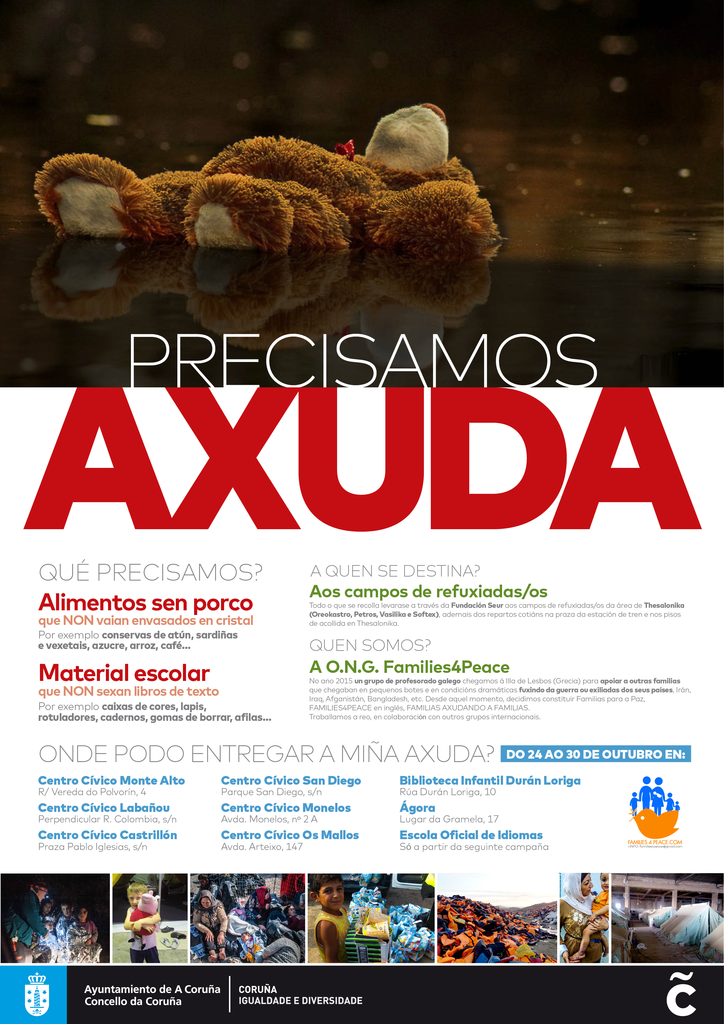 De cara a final de ano, a concelleira de Igualdade destacou tres grandes actuacións, que se levarán a cabo de forma coordinada coas entidades que traballan co colectivo de persoas refuxiadas. A primeira delas é unha campaña de recollida de material específico destinado a cubrir as necesidades que detectan as organizacións sen ánimo de lucro da cidade que traballan directamente nos campos de refuxiados e refuxiadas de Grecia. "Hai moita necesidade de material, pero non sempre se fai un chamamento específico, polo que ao final temos experiencias nas que se recolle unha gran cantidade de obxectos ou de alimentos que son válidos para os campos de refuxio. Así, dende o Concello imos colaborar na organización de campañas de recollida concretas que levaremos a cabo ao longo do ano, tendo lugar a primeira entre o 24 e o 30 de outubro nos centros cívicos de Labañou, Monelos, Os Mallos, San Diego, Monte Alto e Castrillón, ademais da Biblioteca Infantil e Xuvenil e o centro Ágora. Neste caso, esta campaña está centrada específicamente en material escolar e produtos en conservas que non conteñan porco, tendo en conta a maioría musulmana nos campos de refuxiadas. Impulsada pola ONG Families4Peace, contará ademais coa colaboración do alumnado de diversos centros da cidade (IES Agra do Orzán, Salvador de Madariaga, Rafael Dieste, Monelos, Puga Ramón, Eusebio da Guardia, Santa María do Mar, Compañía de María, Salesianos, Zalaeta e Monte das Moas).