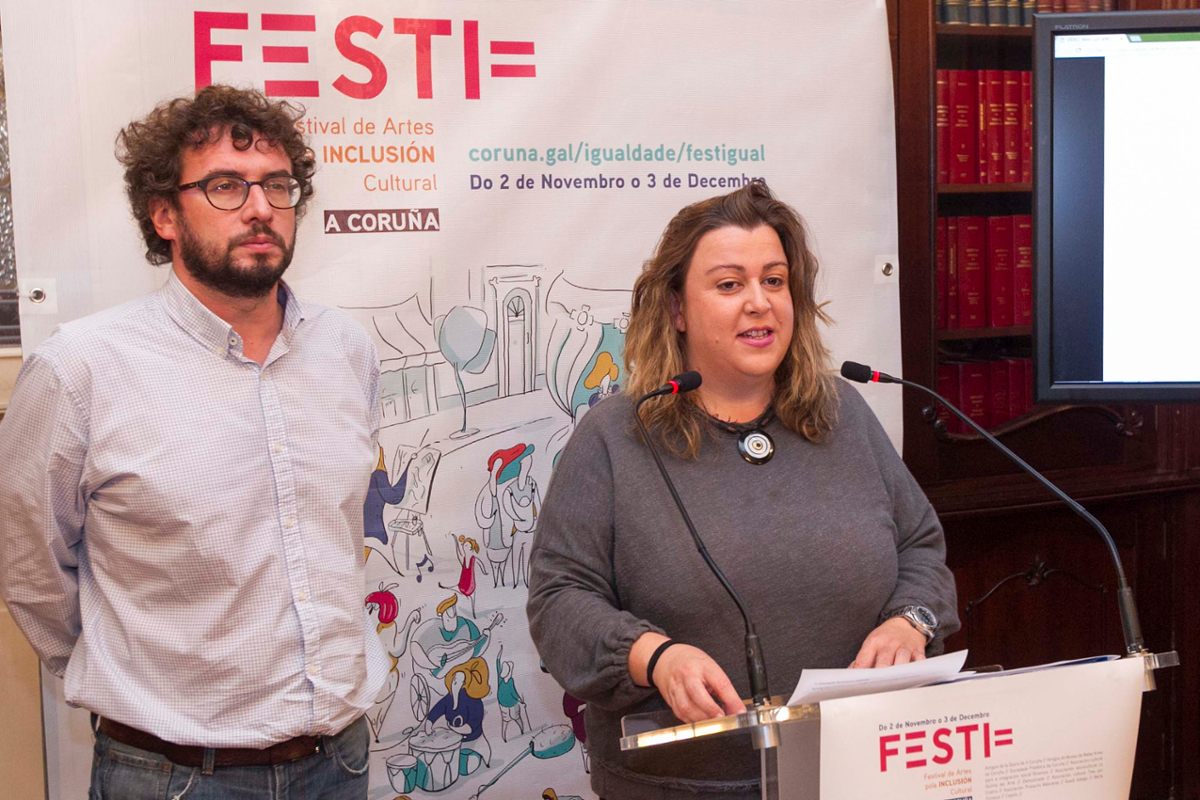 O concelleiro de Culturas, Deporte e Coñecemento, José Manuel Sande, e a edil de Igualdade e Diversidade, Rocío Fraga, presentaron esta mañá a primeira edición do Festi= Festival de Artes pola Inclusión Cultural, que se celebrará desde o día 2 de novembro até o 14 de decembro na Coruña. A proposta, que se expandirá por diversos espazos da cidade e cuxa data central será o Día Internacional das Persoas con Diversidade Funcional e Sensorial, emana da primeira convocatoria do programa Cultura Accesible e Inclusiva, posta en marcha polo Concello da Coruña e a Fundación Emalcsa o pasado ano co obxectivo de favorecer a inclusión e a accesibilidade das persoas con diversidade funcional, sensorial ou cognitiva na vida cultural e artística, excluíndo calquera barreira ou impedimento que dea lugar á súa discriminación. "O Festi= comprende unha serie de accións en relación aos sete proxectos artísticos resultantes da primeira convocatoria de Cultura Accesible, e porá o colofón á actividade cultural e inclusiva deste ano", destacou José Manuel Sande, quen lembrou que até o 15 de novembro "está aberta a convocatoria da segunda edición". "A idea de cultura accesible implica brindar iguais condicións de participación a todas as persoas que forman parte da nosa sociedade e que, por algunha razón física ou cognitiva vense privados do pleno goce dos seus dereitos. Implica permitir o goce das manifestacións artísticas ou culturais a todas as persoas", afirmou o responsable municipal.