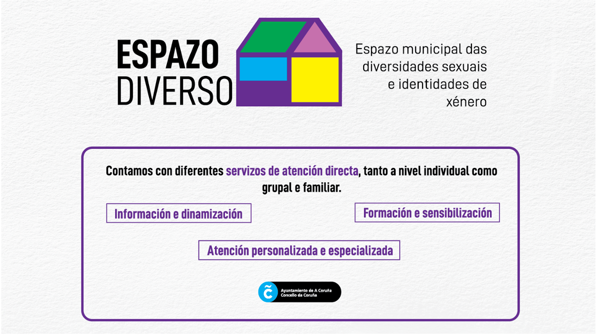O Espazo Diverso é un recurso público dirixido a todas as persoas lésbicas, gais, trans, bisexuais, intersexuais, queer e asexuais, ás súas familias e ás entidades LGTBIQA+ da cidade.