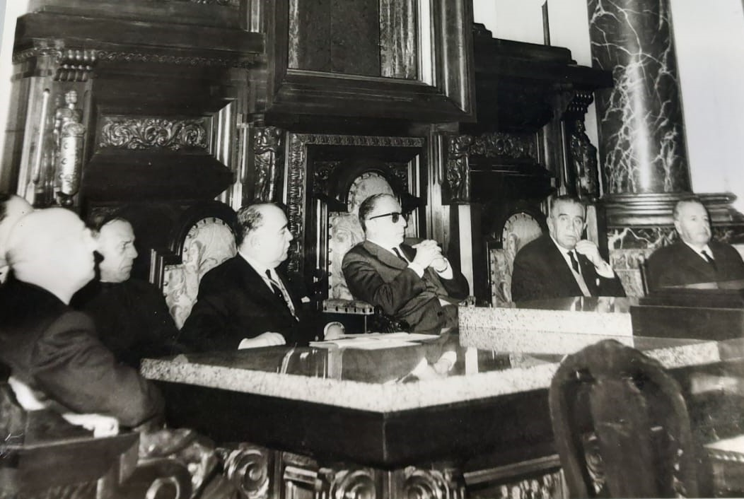 Sesión académica na Sala Capitular do Concello para a inauguración dás tarefas do Instituto. Enrique Míguez Tapia, Santiago Fernández, Eduardo Sanjurjo de Carricarte, Evaristo Martín Freire, Rafael Puga Ramón e Francisco Serrano Castela.