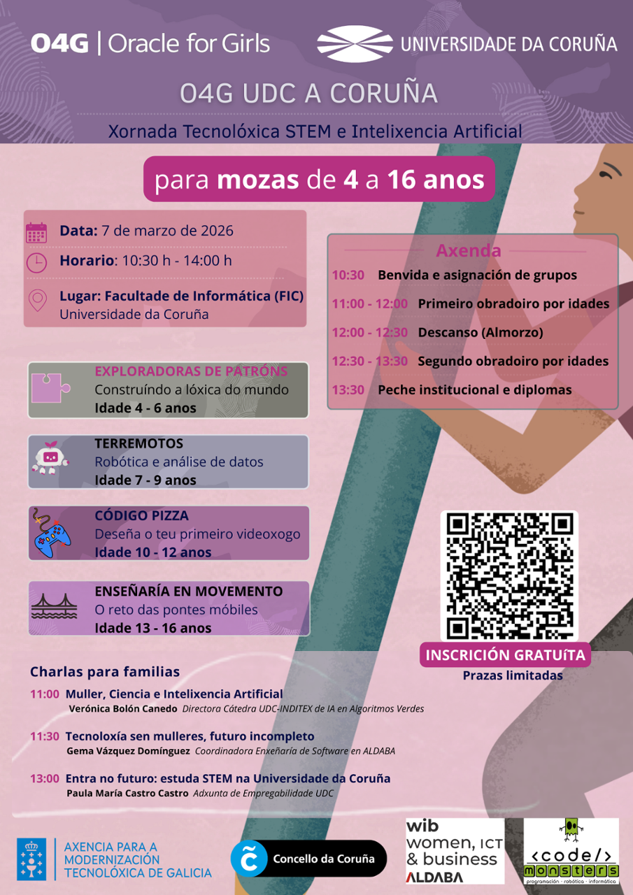O vindeiro 7 de marzo a Universidade da Coruña e Oracle organizan na Facultade de Informática da UDC unha xornada formativa dirixida a nenas e mozas entre 4 e 16 anos enmarcada na conmemoración do Día Internacional da Muller (8 de marzo) e orientada a promover a igualdade de xénero no ámbito científico e tecnolóxico e a espertar vocacións no eido STEM (Ciencia, Tecnoloxía, Enxeñaría e Matemáticas).