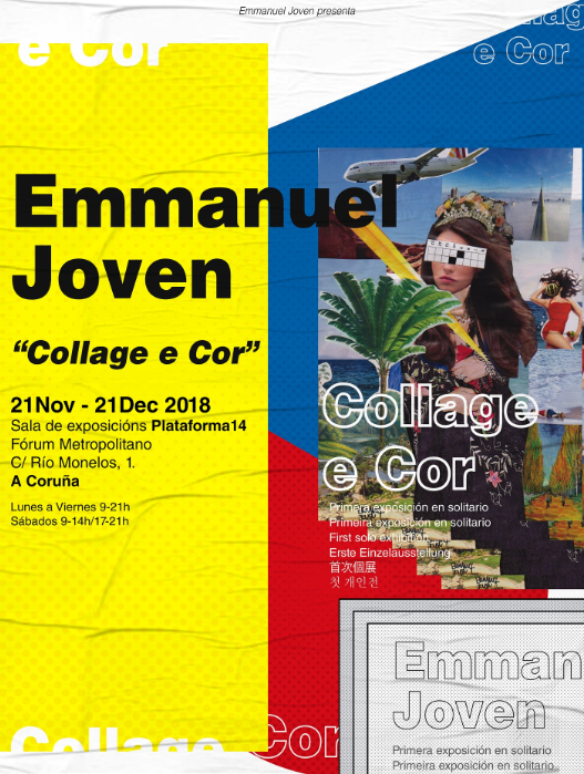 A sala Plataforma14 situada no edificio Fórum Metropolitano da Coruña, acolle dende o 21 de novembro a mostra expositiva “Collage e Cor” do artista Emmanuel Joven. “Collage e cor” é unha recopilación dos mellores traballos do artista galego Emmanuel Joven, por primeira vez expostos ó público en formato físico. A colección selecciona 40 traballos realizados polo autor mediante a técnica do collage.
