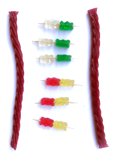 - Este código es muy particular. Siempre se empareja de manera específica: A se empareja con T, y C se empareja con G. En tu modelo, el rojo sólo se combina con el amarillo, y el transparente sólo se combina con el verde. Usa palillos para hacer parejas de colores con las gominolas, colocando una en cada extremo del palillo. Tienes que hacer 6 pares, cada uno de color amarillo-rojo y verde-transparente. No se permiten otras combinaciones de colores.