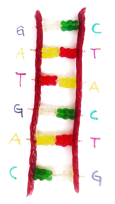 - Tu modelo de ADN probablemente se parece al de la imagen, aunque tu secuencia podría estar en un orden diferente. ¡Vale así también! Coloca tu modelo en una hoja de papel y usa un bolígrafo para escribir las letras junto a cada gominola.