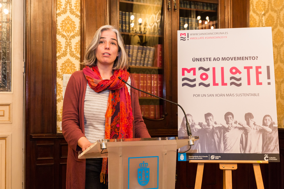 A concelleira de Medio Ambiente, María García, presentou esta mañá unha nova edición de Móllate!, o programa que está dirixido á mocidade para implicala no coidado do medio ambiente en relación ás festas de San Xoán. "Estamos asistindo a un movemento da mocidade, de moitas cidades e países, que se está mobilizando para pedirnos que actuemos e que é plenamente consciente de que as decisións que tomemos agora van ter consecuencias no futuro e lles van afectar a eles. Estannos pedindo que actuemos", contextualizou a edil, que resaltou o feito de que na Coruña "haxa tamén mocidade implicada, que ten a madurez, a sensibilidade e creatividade necesaria para lembrarnos que somos responsables de tomar decisións". Neste contexto, a concelleira explicou que está xa aberto o prazo para participar na cuarta edición deste programa cuxo obxectivo é promover a educación ambiental, a participación e a acción para que a mocidade deseñe as estratexias da Concellería de Medio Ambiente  para sensibilizar á cidadanía de cara ás festa do San Xoán.
