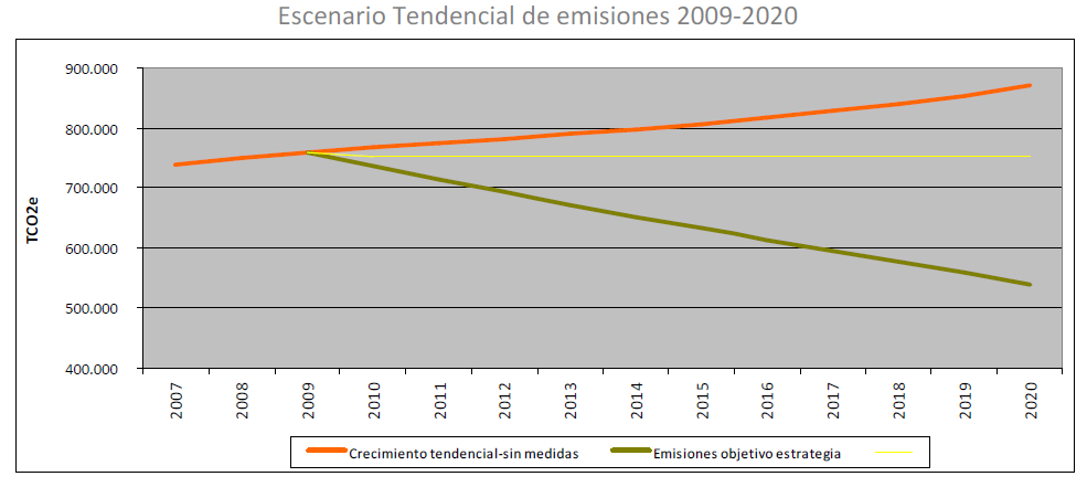 Coa aplicación das medidas e liñas de actuación descritas no apartado seguinte, encamiñadas en tres vertentes, a redución de emisións, xeración de enerxías renovables e a potenciación do efecto sumidoiro, constrúese o escenario plan. Este escenario final pretende acadar unhas emisións netas de 600.746 tCO2e para o ano 2020, cumprindo así cos obxectivos estratéxicos de redución de emisións e xestión de sumidoiros, reducindo nun 20% as emisións do ano base (2009) que son de 750.933 tCO2e.