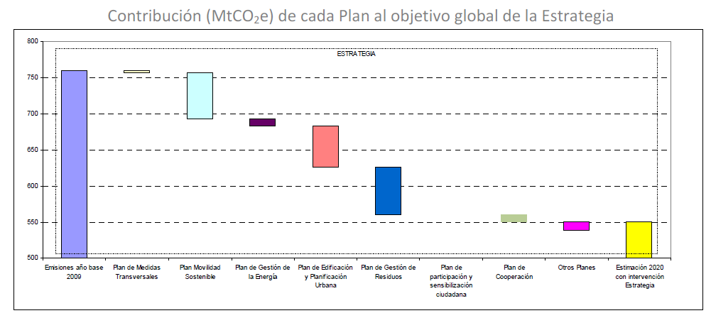 As liñas de actuación enunciadas en cada plan e programa teñen un dobre propósito. Por unha banda, reforzar as iniciativas xa postas en marcha polo Concello da Coruña e, polo outro, desenvolver áreas novas de acción alí onde aquelas non resultan suficientes. A continuación móstrase a contribución de cada plan de actuación ao obxectivo global da Estratexia de redución do 20% de emisións sobre o ano base (2009).