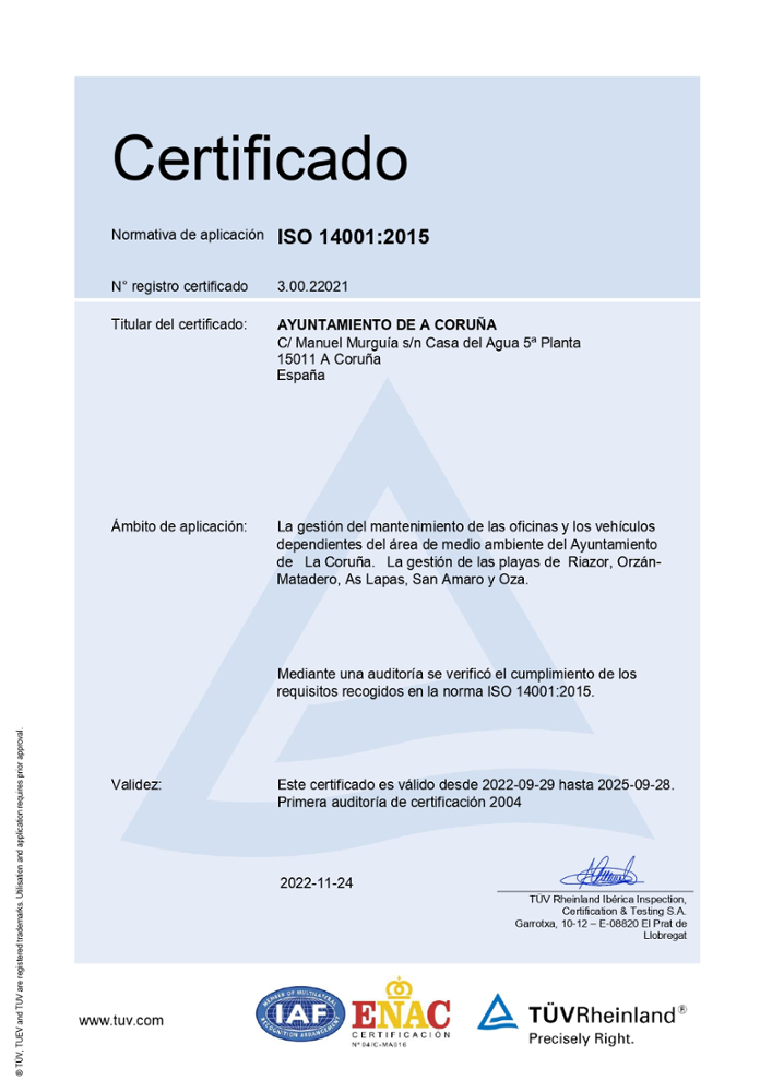 O Concello da Coruña, consecuente co compromiso de establecer un modelo de desenvolvemento que sexa sustentable, tomou, entre outras iniciativas, a de establecer un Sistema de Xestión Ambiental que inclúa algunhas das actividades levadas a cabo polo Servizo de Medio Ambiente, como a xestión das praias de Riazor, Orzán, Matadoiro, As Lapas, San Amaro e Oza, así como das oficinas e dos vehículos do servizo, todo iso conforme aos requisitos da norma internacional UNE-NISO 14001:2015.
