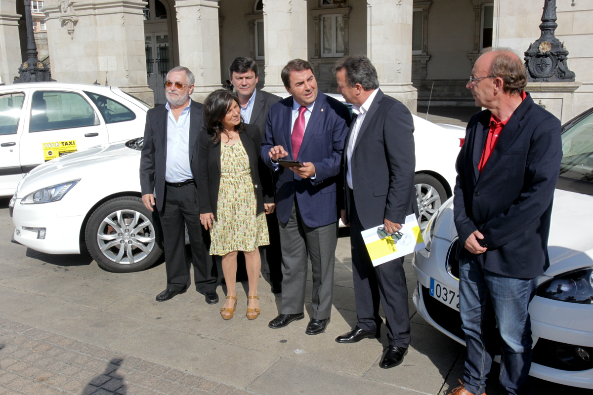 El alcalde de A Coruña, Carlos Negreira, acompañado por la concejala de Tráfico y Movilidad, Begoña Freire, y por el presidente de la Asociación local de Autotaxis de A Coruña (Tele-taxi), Manuel Sánchez Quindimil, ha participado esta mañana en la presentación de Taxiclick, una nueva aplicación que la asociación pondrá en marcha en los próximos días en la ciudad y que posibilita la reserva de taxis de forma gratuita a través de dispositivos móviles y smarthphones.