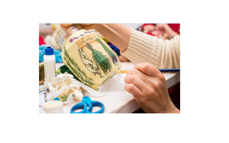 El taller se basa en decorar objetos como cajas, bandejas, platos, etc. con papel de arroz o papel de servilleta decorado.