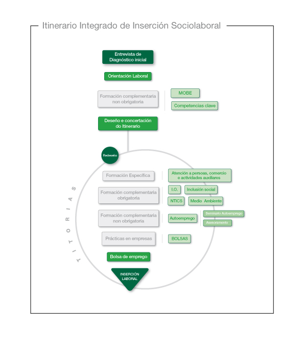 Los itinerarios se definen, en el proyecto Rede Coruña Emprega II, como un proceso integral y personalizado por el que pasan las personas en situación de desempleo, con el objetivo de facilitar su inserción sociolaboral.