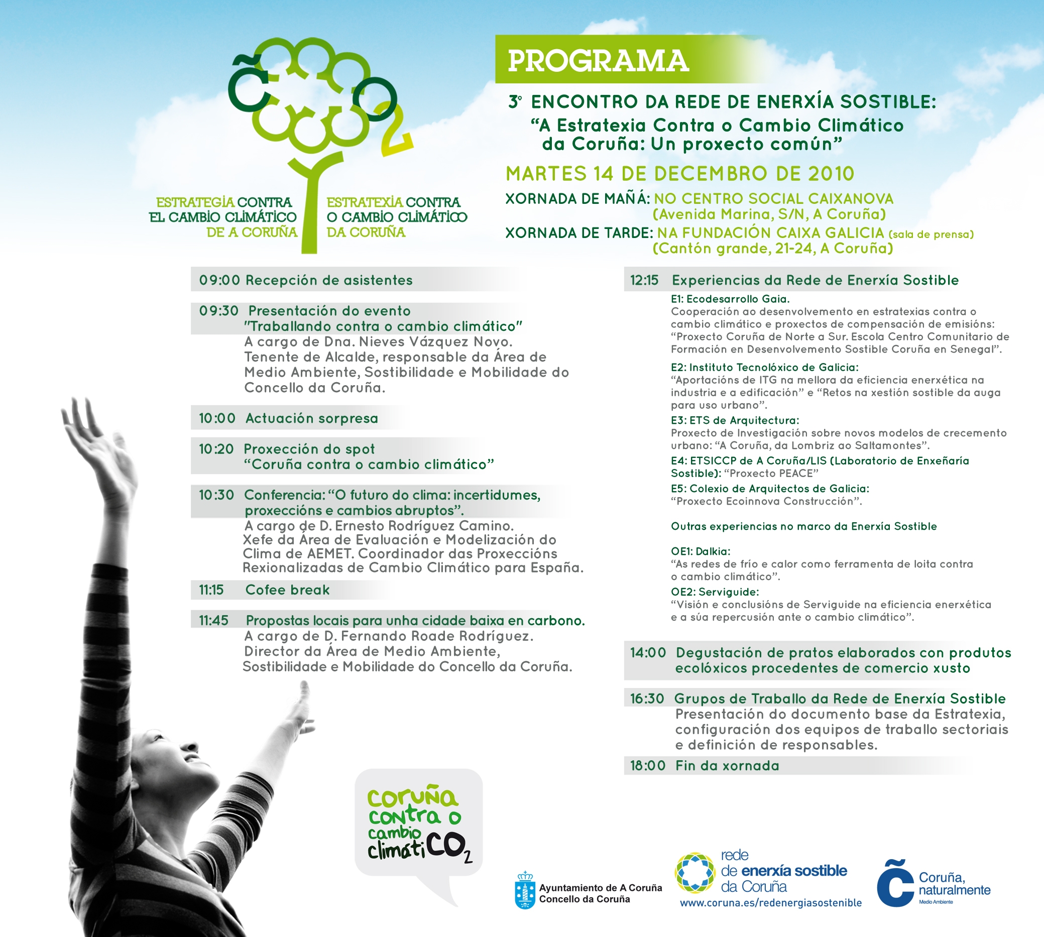 A media mañana habrá un espacio para las “Propuestas locales para una ciudad baja en carbono”, a cargo de Fernando Roade Rodríguez, director del Área de Medio Ambiente del Ayuntamiento coruñés. Tras esta intervención, expondrán sus propias experiencias los miembros de la Red de Energía Sostenible: Ecodesarrollo Gaia, Instituto Tecnolóxico de Galicia, ETS de Arquitectura, ETSICCP de A Coruña/LIS (Laboratorio de Ingeniería Sostenible y Colegio de Arquitectos de Galicia. También intervendrá Dalkia y Serviguide con otras experiencias en el marco de la Energía Sostenible.