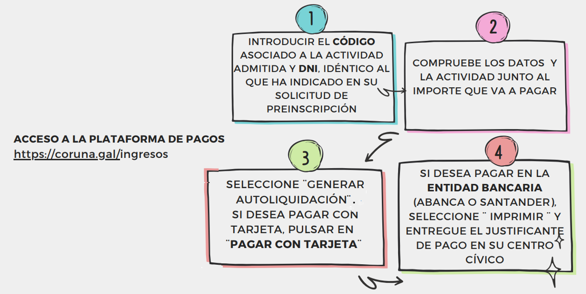 No documento que se achega abaixo aparece de forma gráfica o modo de facer o pagamento de actividades para aquelas persoas que aparezan nas listaxes de admisións, que se publicarán o luns día 18 de setembro. No propio documento gráfico hai unha ligazón sobre o que poder premer e ir directamente a