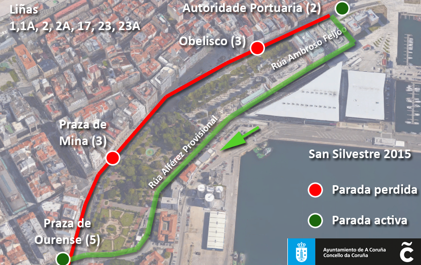 El servicio de de autobús urbano experimentará modificaciones en las líneas que recorren el centro de la ciudad con motivo de la celebración de la VI San Silvestre Coruña. El principal cambio del transporte público será el corte en los Cantones. Las líneas 1, 1A, 2, 2A, 17, 23 y 23A cambiarán el itinerario de salida de la ciudad y circularán por Ambrosio Feijoo y Alférez Provisional.