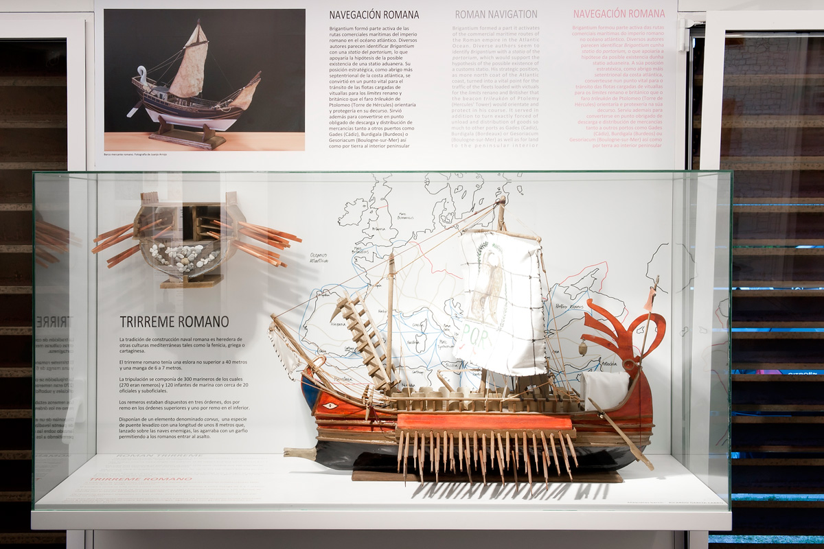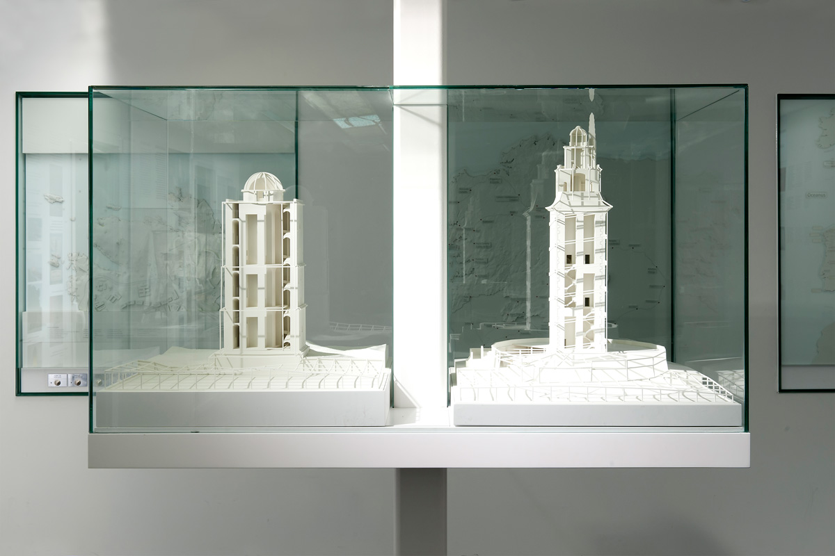 En el segundo espacio, en la parte izquierda, se disponen distintos módulos, mapas, maquetas y pantallas interactivas que ofrecen al visitante información acerca de la evolución histórica del faro y su entorno desde el punto de vista patrimonial, cultural y social. Se muestran tres mapas en relieve en los que se analizan datos relativos al bien, incidiendo en la importancia de las rutas comerciales desde la época romana hasta nuestros días y sitúa al espectador en el contexto temporal que dio origen al faro. Se expone también una maqueta de un trirreme romano, además de la reconstrucción hipotética del edificio en época romana junto a la Torre actual, lo que permite comparar los dos momentos históricos del edificio y recrear el original.