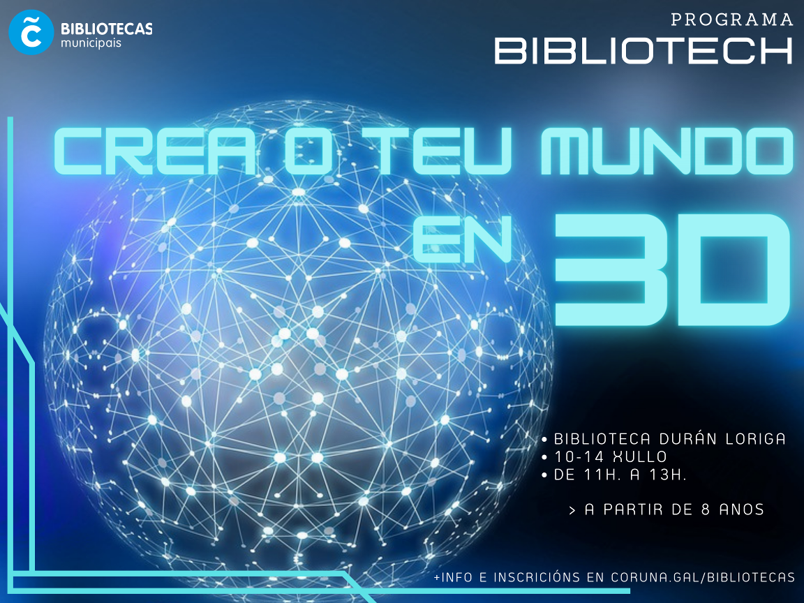 Dentro do Programa BiblioTECH, da Biblioteca Durán Loriga formarase as e os asistentes coas pautas para aprender a deseñar en 3D e posteriormente formar no manexo e mantemento dunha impresora 3D. Tratarase de formar e dar a coñecer todo o posible a existencia e utilización de ferramentas libres tanto de software como de hardware.