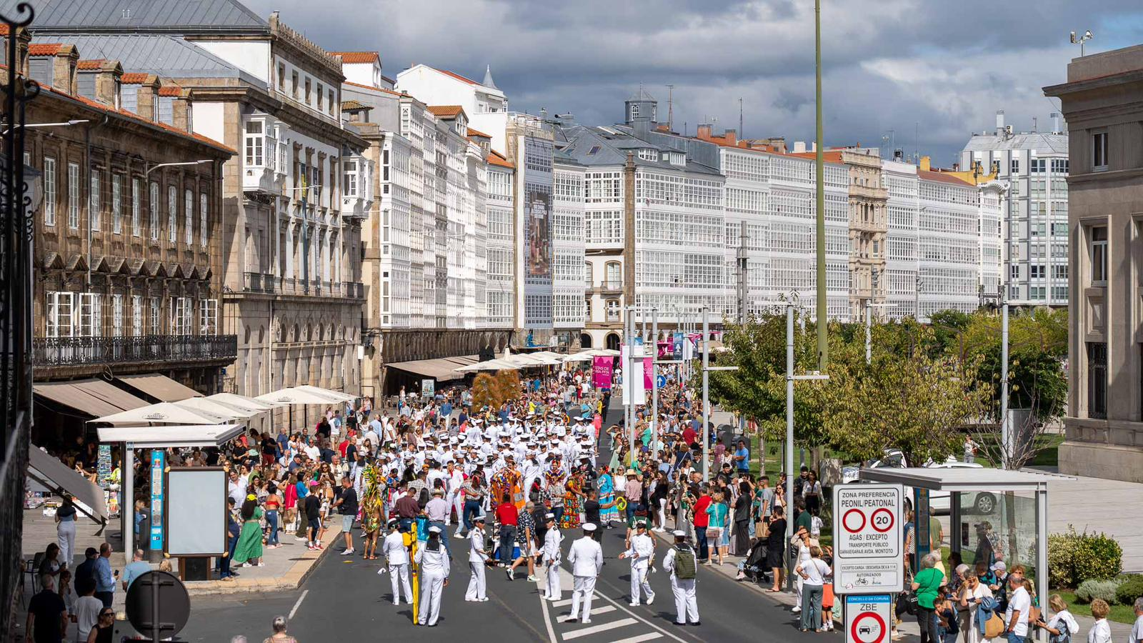 As tripulacións da Tall Ships Races, que ata este domingo pola mañá estarán na Coruña, protagonizaron hoxe o tradicional desfile desta regata entre os Cantóns e a praza de María Pita.