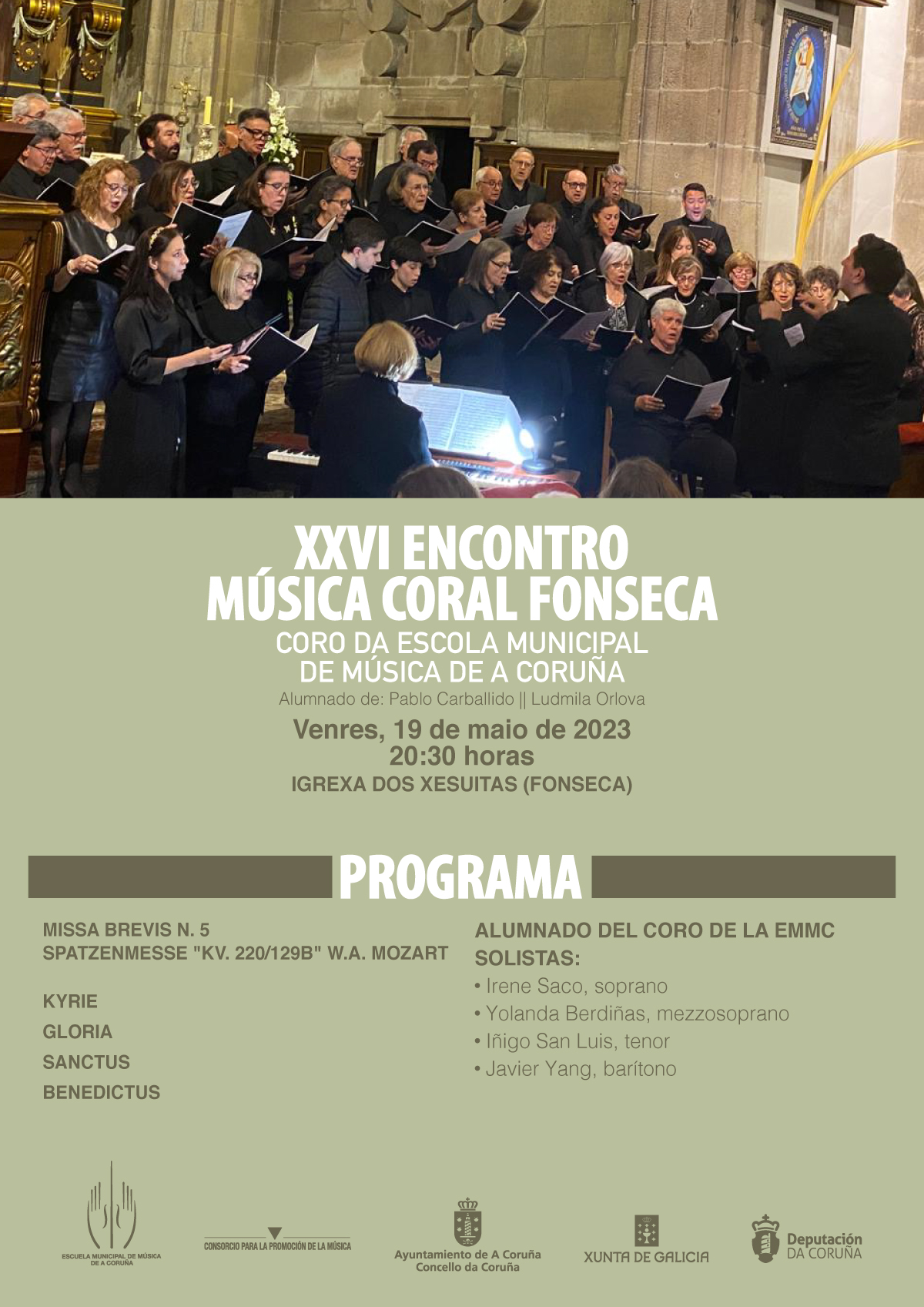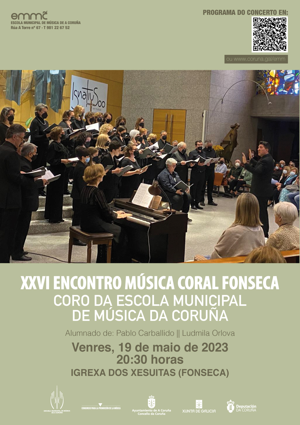 El viernes 19 de mayo el alumnado del Coro de la EMM del profesores Pablo Carballido y Ludmila Orlova, participarán en el concierto "XXVI Encuentro Música Coral de Fonseca" en la Iglesia de los Jesuítas (Fonseca) a partir de las 20:30 horas.