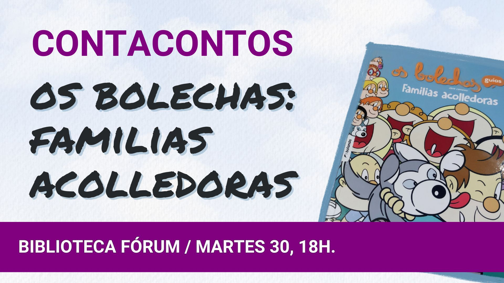 A través dun contacontos desenvolvido pola Asociación Acougo arredor do libro "Os Bolechas. Familias acolledoras", onde Balbino chega á casa dos irmáns Bolechas para compartir temporalmente con eles fogar e aventuras, abórdase a realidade dos nenos e nenas e adolescentes que pasan por procesos temporais de acollida e dáse a coñecer esta medida de protección da infancia, ademais de sensibilizar sobre distintas realidades vitais de nenos e nenas.