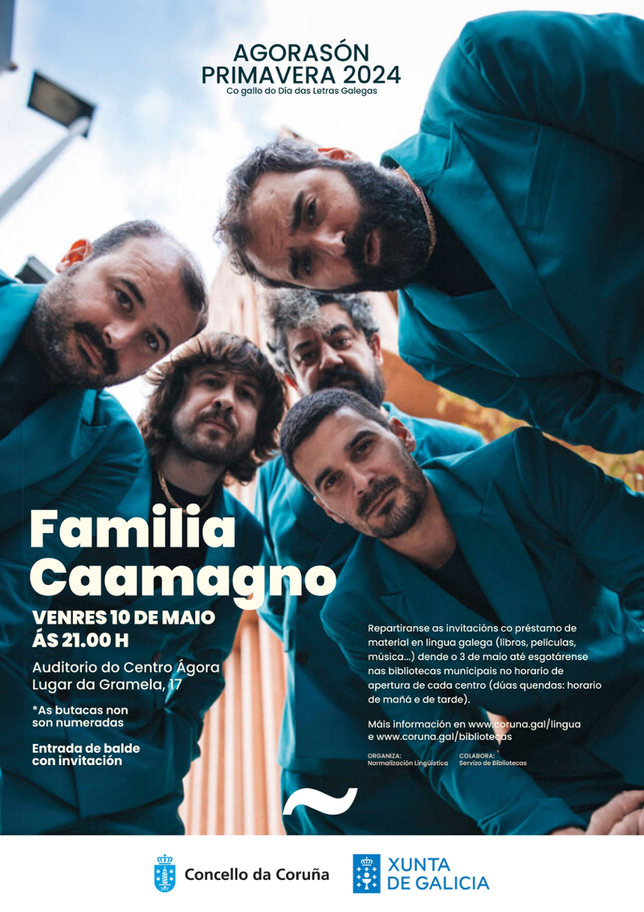 Co gallo do Día das Letras Galegas e para promover a lectura en lingua galega e o préstamo de material audiovisual, Normalización Lingüística, en colaboración coas Bibliotecas Municipais do Concello da Coruña, organiza o AgoraSón primavera 2024, con Familia Caamagno en concerto.