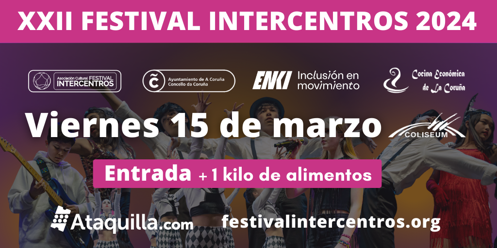 El XXII Festival Intercentros 2024, ciudad de A Coruña, te invita a participar en su anual gala solidaria el viernes 15 de marzo, a partir de las 17:00 h, en el Coliseum, en favor de Enki y Cocina Económica. Este proyecto mira tanto a trabajar en favor de la inclusión social desde la movilidad, como a ayudar a coruñeses que están en necesidad. Los estilos que verás en la gala musical y solidaria serán: directo, canción y coreografías, todo dentro de una realización profesional. Además de tu entrada de colaboración, también recolectaremos, durante toda la tarde, alimentos no perecibles para Cocina Económica. El Festival Intercentros es una actividad patrocinada por el Excelentísimo Ayuntamiento de A Coruña. ¡Contamos contigo!