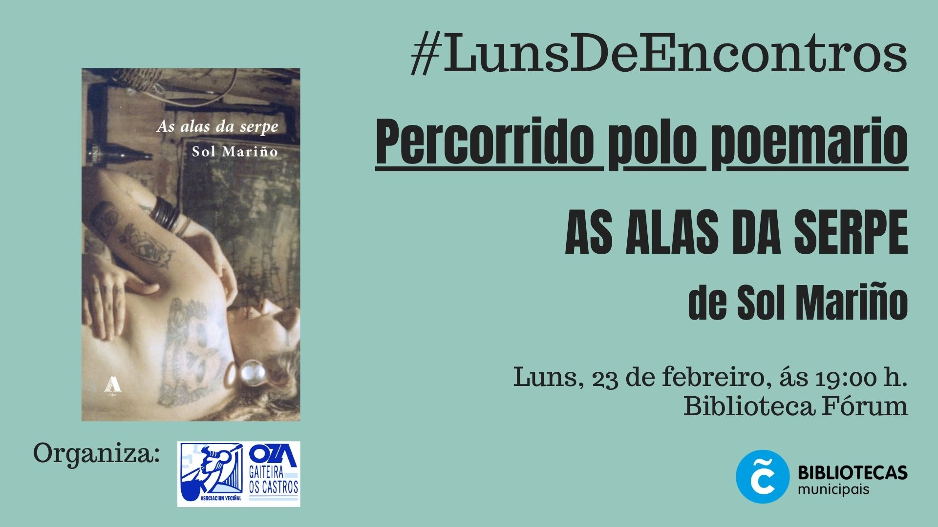 O luns 23 de febreiro ás 19 h., na Biblioteca Fórum Metropolitano, temos un percorrido polo poemario de "As alas da Serpe" de Sol Mariño, publicado por Aira Editorial.