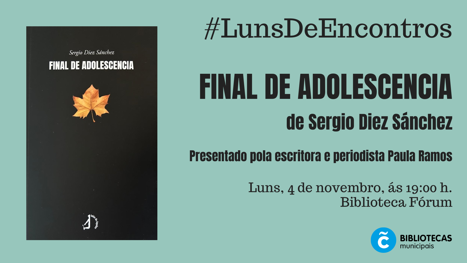 El lunes 4 de noviembre a las 19 h. en la Biblioteca Municipal Fórum Metropolitano tendremos la presentación del libro "Final de adolescencia" de Sergio Diez Sánchez, publicado por la editorial Talón de Aquiles.