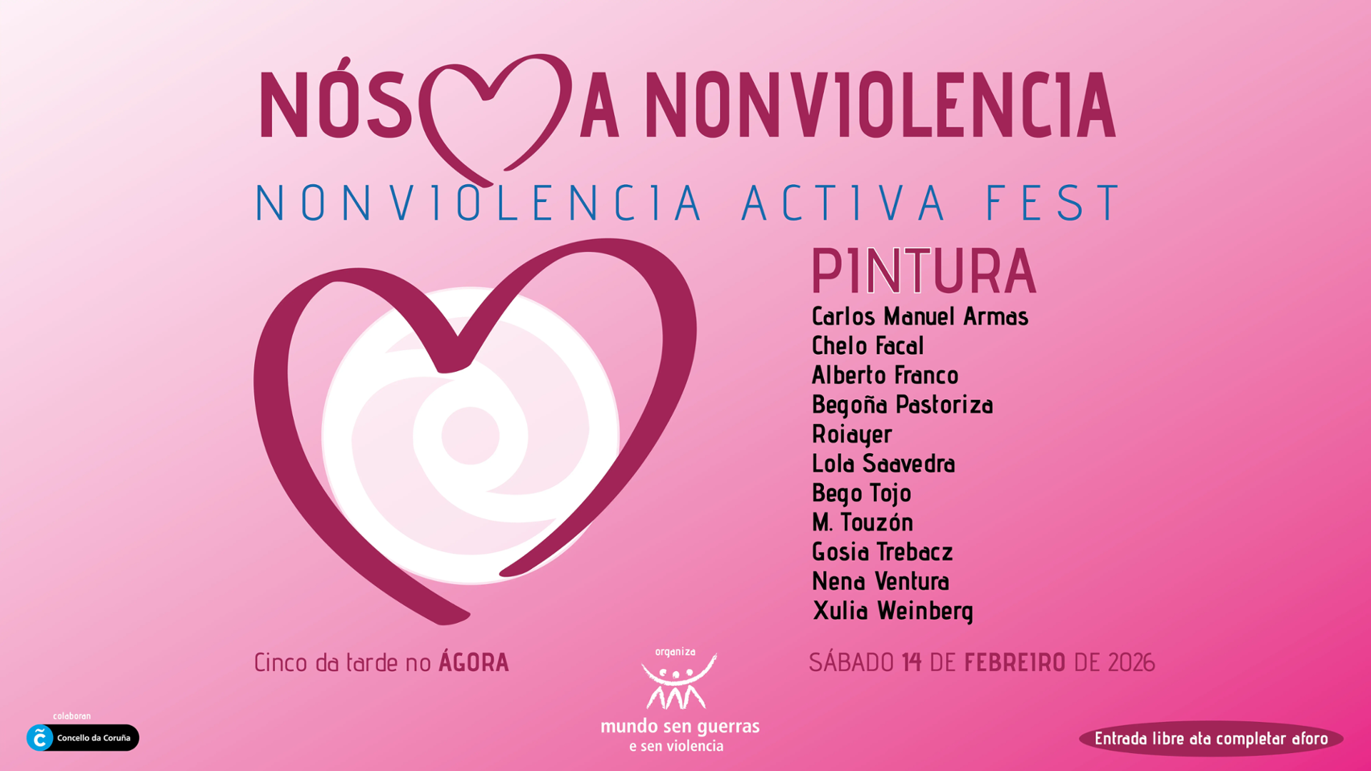 Un encontro de artes diversas ao servizo da paz e da noviolencia, con máis dunha quincena de artistas residentes na Coruña e en Galicia, unidos por unha idea común: loitar contra todas as violencias defender os dereitos humanos construír un futuro mellor