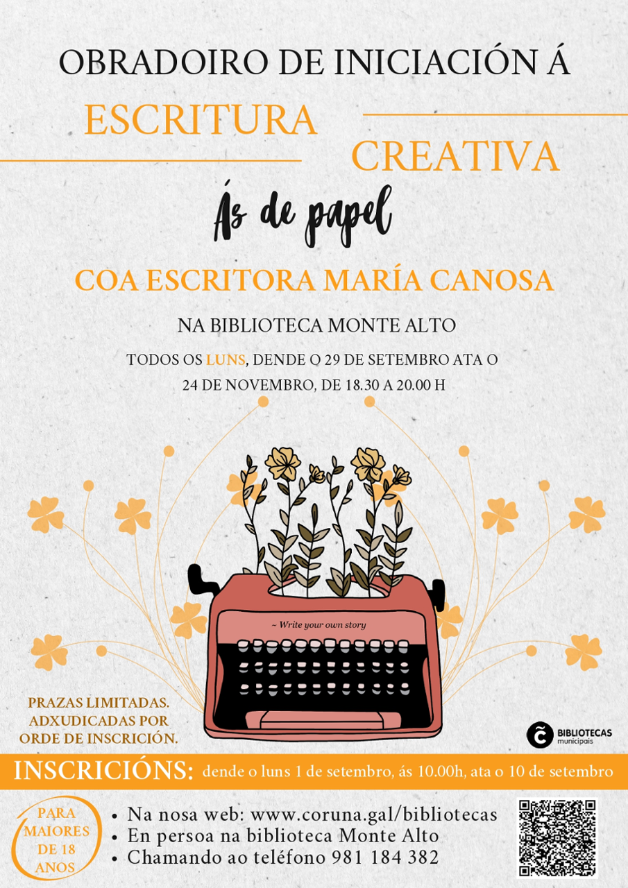 Se algunha vez quixeches escribir pero o papel en branco te impón, este é o teu momento. A escritora galega María Canosa Blanco acompañarate nun obradoiro onde a teoría e a práctica camiñarán da man para espertar a túa creatividade.