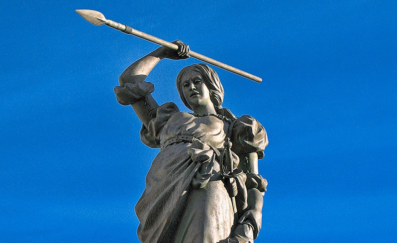 La estatua, que preside la Plaza de María Pita, representa a la heroína con la lanza en posición de ataque y el cuerpo sin vida de su esposo a sus pies.