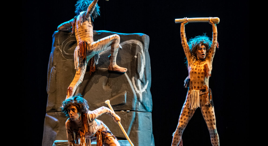 Tres personajes homínidos distintos se refugian de la amenaza de los lobos junto a los restos óseos de un mamut.