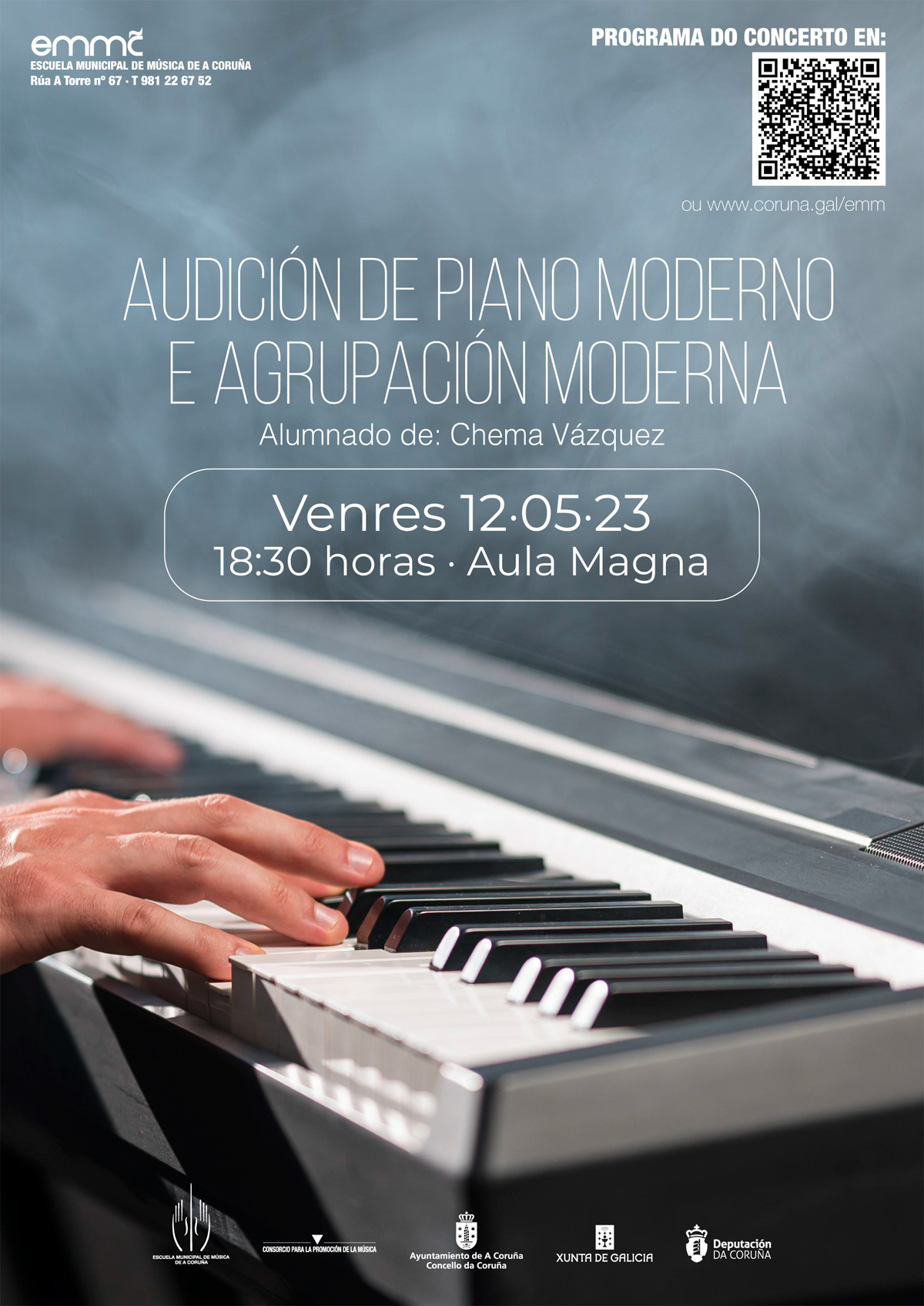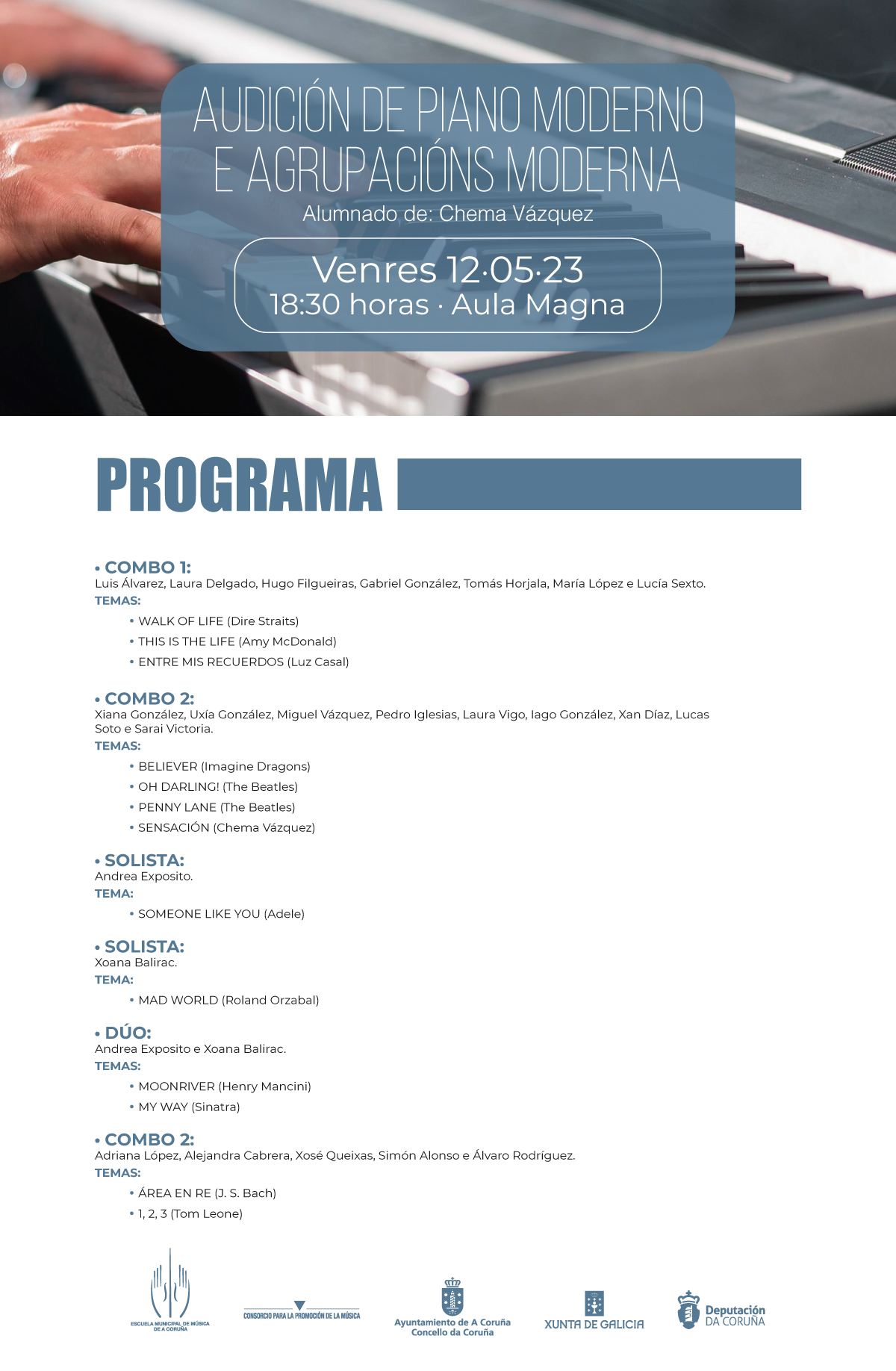 El viernes 12 de mayo el alumnado de Piano Moderno del profesor José María Vázquez, darán un concierto en el Aula Magna a partir de las 18:30 horas.