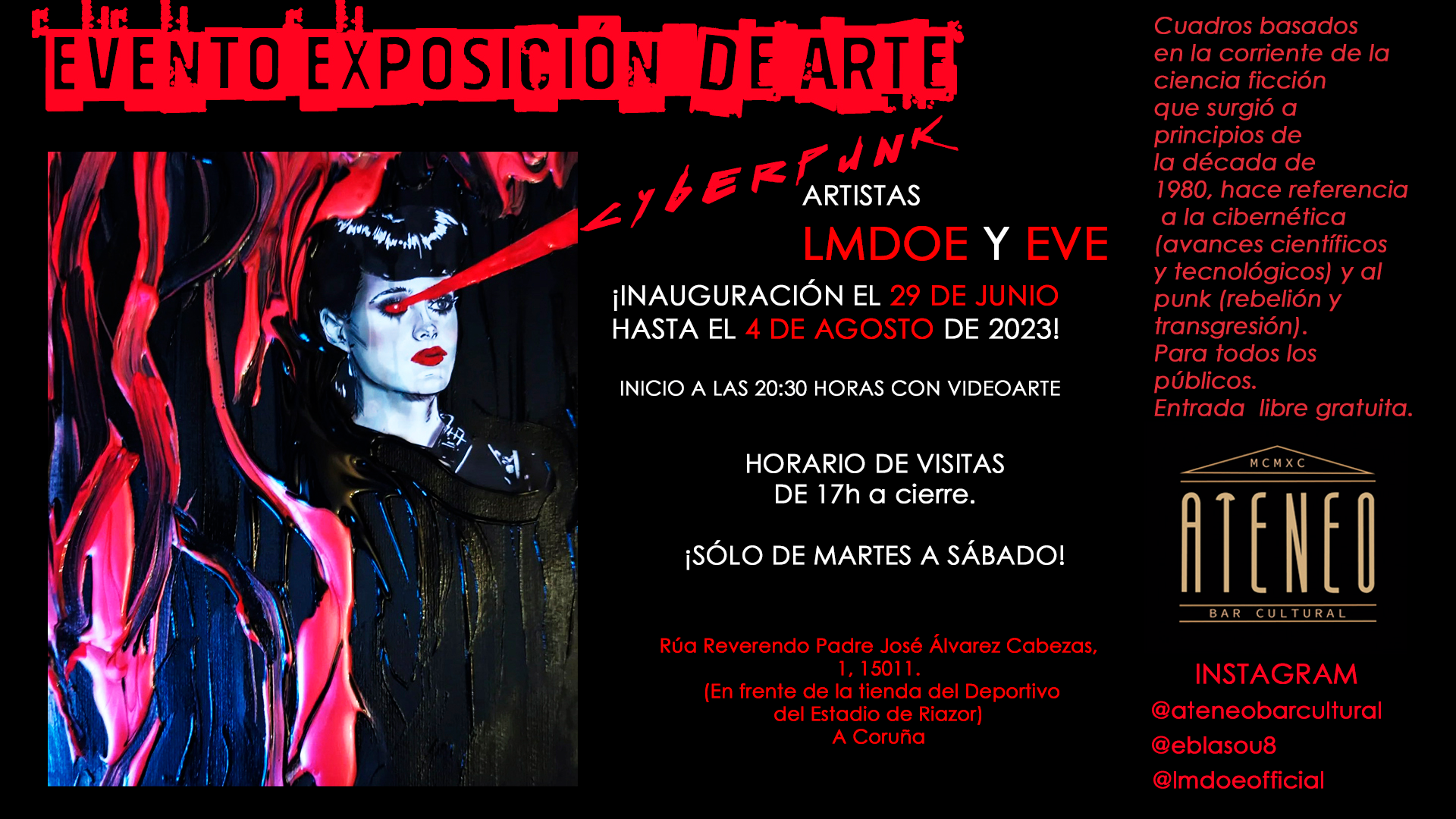 La exposición "Cyberpunk" es la séptima muestra de LMDOE y promete una experiencia artística única e inolvidable, con la colaboración de su madre, alias EVE, hija del pintor Ramón Blanco Casal. Los amantes del arte y los entusiastas del género, no pueden perderse esta oportunidad de adentrarse en un mundo transgresor y fascinante.